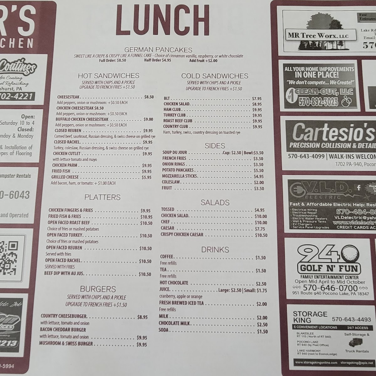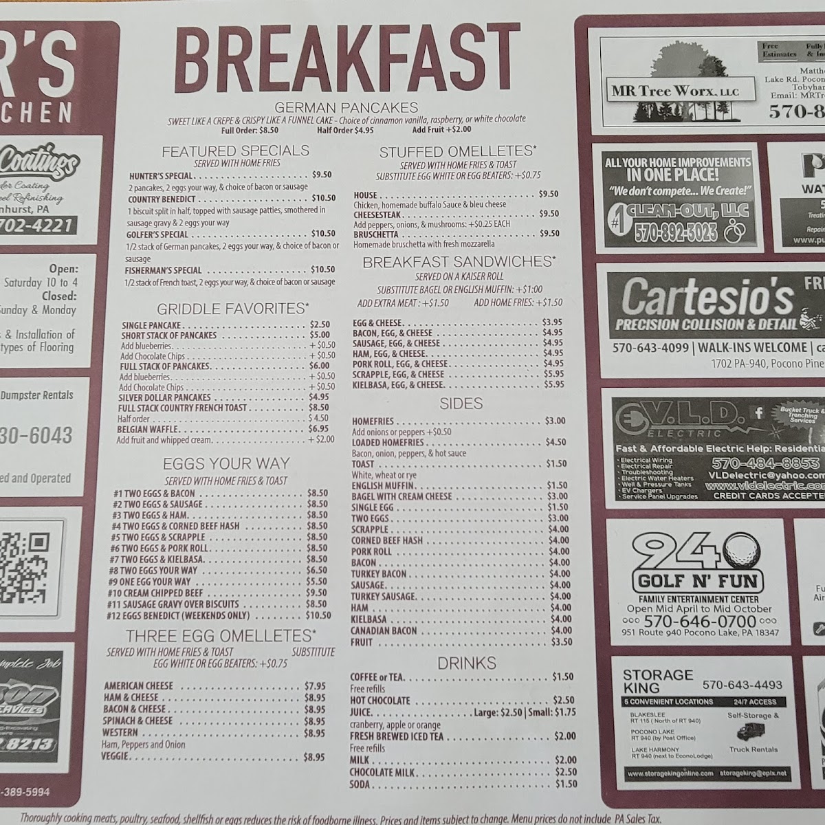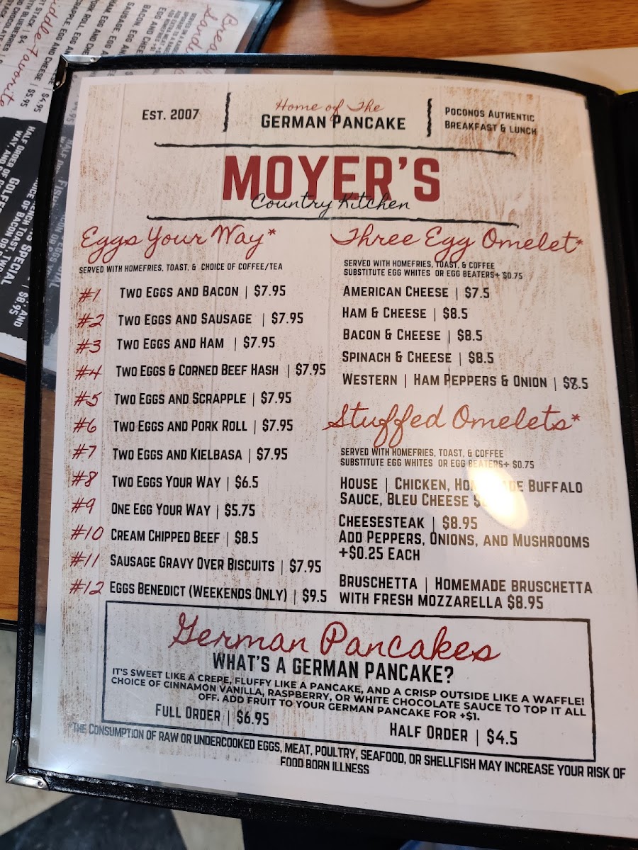 Moyer's Country Kitchen, nestled in Pocono Lake, PA, is a beloved eatery celebrated for its hearty, home-style breakfasts and welcoming atmosphere. Patrons rave about the perfectly cooked omelets and delectable German pancakes, which have set a high standard for breakfast fare. The lunch menu features a variety of satisfying cold sandwiches, platters, and comforting drinks, ensuring there's something to please every palate. With friendly staff and a cozy, if rustic, decor, this hidden gem offers a genuine taste of local hospitality. Whether you're a tourist or a regular, Moyer's promises a delightful dining experience that will keep you coming back for more.